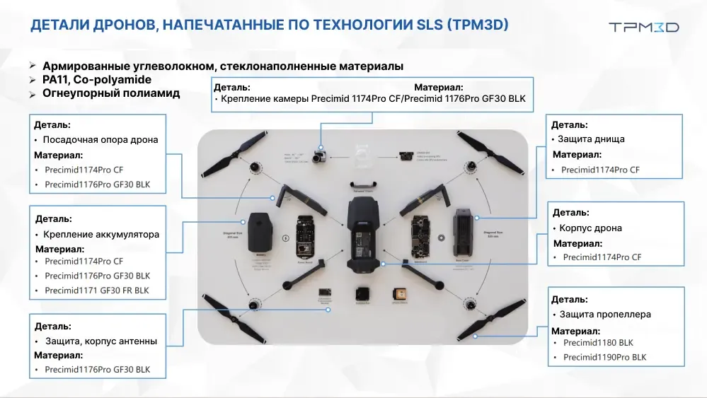 Многолетние инвестиции TPM3D в системы печати SLS, исследования и разработки современных передовых материалов делают TPM3D надежным партнером для фирм-производителей дронов, стремящихся к более быстрым циклам разработки, увеличению производительности и снижению производственных рисков.
