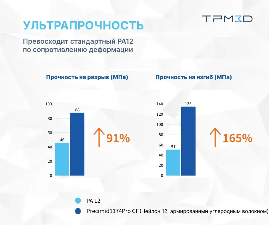 По сравнению с нейлоном 12 без наполнителя, версия, армированная углеродным волокном, обеспечивает увеличение прочности на разрыв на 91% (88 МПа) и увеличение прочности на изгиб на 165% (135 МПа), а также позволяет получить значительно увеличенную жесткость материала. Это обеспечивает высокую устойчивость к деформации и растрескиванию в процессе эксплуатации дрона.