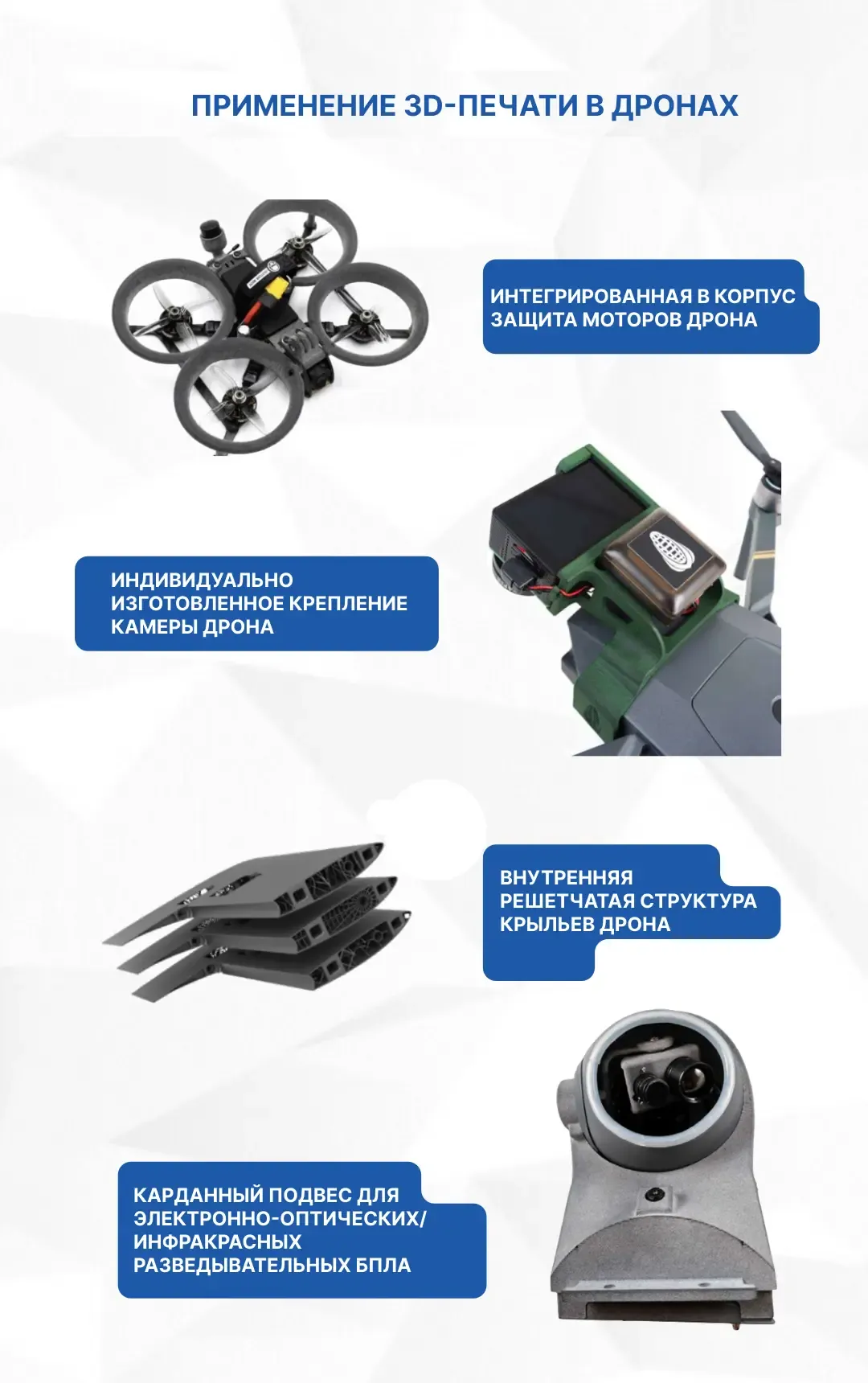 Эти материалы подходят для различных компонентов БПЛА. В мультироторных дронах их можно использовать для производства защиты днища, пропеллеров, корпусных изделий, держателей аккумуляторов и других частей дрона. В беспилотных летательных аппаратах с неподвижным крылом они применяются в интегрированных фюзеляжах, топливных баках и внутренних конструкциях крыла. Полимерные порошковые материалы и технологии TPM3D обеспечивают производителям широкие возможности для удовлетворения современных требований к конструкции дронов, снижению веса аппаратов, увеличению дальности полета и полезной нагрузки БПЛА.