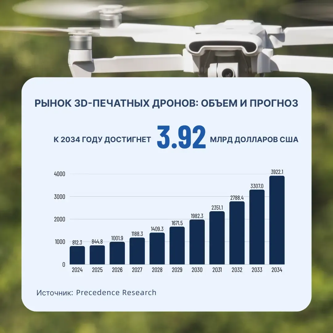По данным Precedence Research, ожидается, что мировой рынок дронов, напечатанных на 3D-принтере, вырастет с 812 млн долларов США в 2024 году до 3,92 млрд долларов США к 2034 году, при совокупном годовом темпе роста 17,1%.
